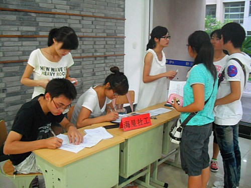 当记者一进学院楼,招兵买马的火爆场面便呈现在我们的眼前。每个社团的负责人努力的介绍着自己社团的特色,用各种方式彰显社团的亮点。因此,招新刚开始不久,各社团的招新现场便是人山人海,新生们踊跃报名,积极参加,他们都在寻寻觅觅,寻找着那个自己感兴趣的社团。为了此次招新活动圆满召开,社管中心的全体干事纷纷出动,搭设“社管中心咨询台”,为新生们介绍各个社团的职务。他们温暖的笑容,详细的解答,赢得了在场新生们的好评。