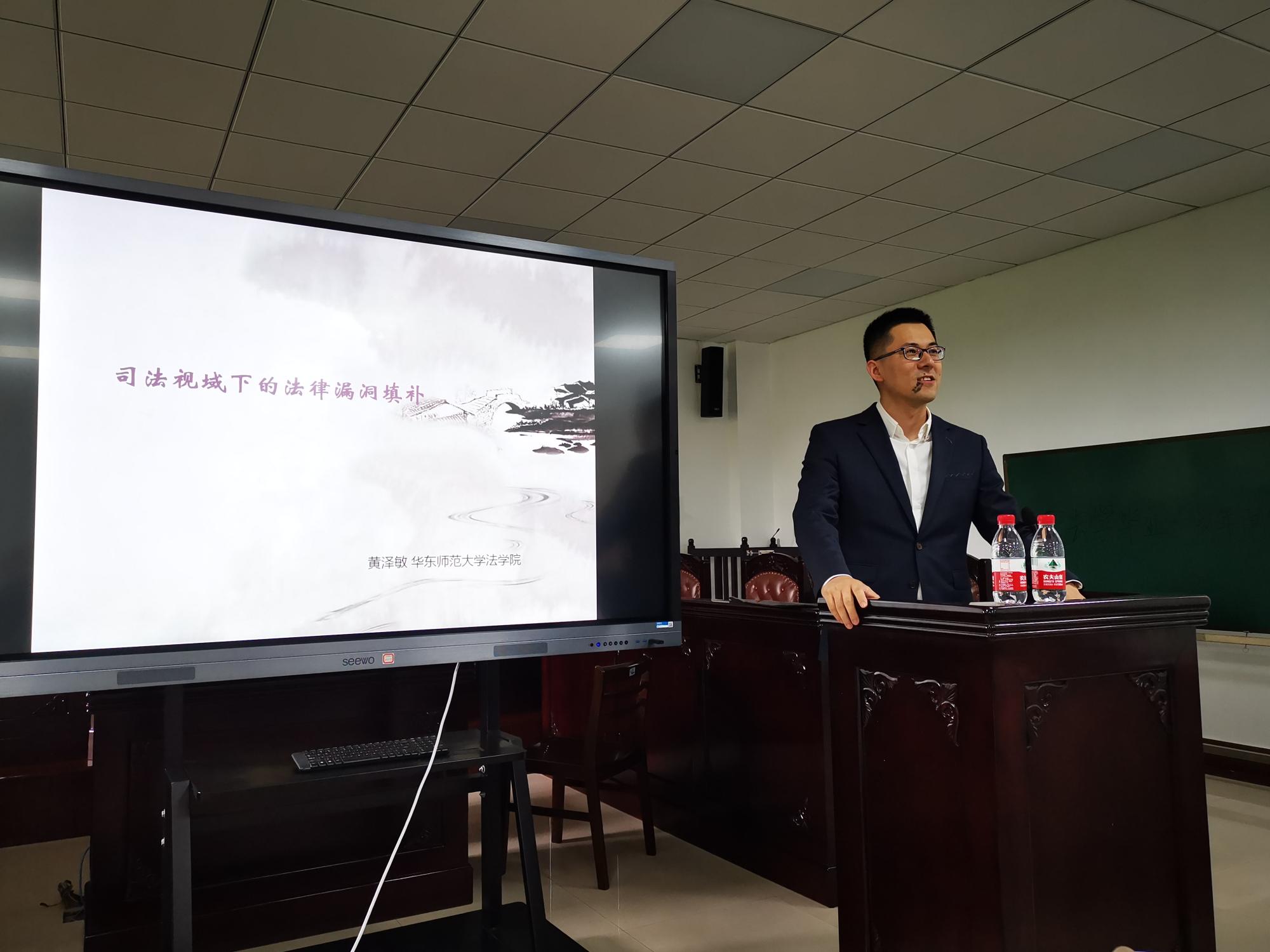 5月28日下午,华东师范大学法学院黄泽敏副教授应邀来我院参加法理学系与民商法系联合举办的第十七期法学理论学术沙龙,为我院师生作了一场题为“司法视域下的法律漏洞填补”的学术讲座。本次讲座由我院法理学副系主任龚金镭博士主持,我院民商法系副主任朱晶晶博士与谈,法理学系与民商法系教师及部分研究生参与了沙龙的讨论。