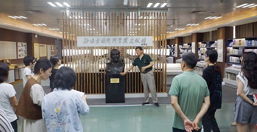 在老党员沈国弟的带领下,党员们参观了图书馆思政教育基地孙冶方经济科学奖文献馆。通过了解孙冶方、薛暮桥的生平、浏览历届“孙奖”获得者成果,党员们学到了老一辈无产阶级革命家求真务实、严谨精深的学术精深与存同求异、宽厚包容的博大胸怀,坚定了投身共产主义事业、为民族复兴伟业增光添彩的决心。