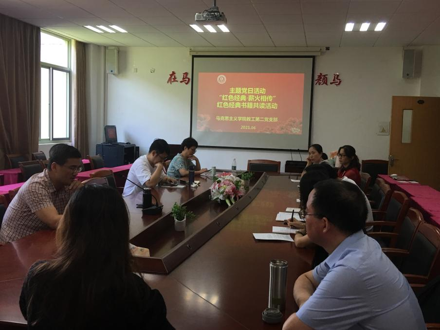 为深入贯彻习近平总书记在党史学习教育动员大会上的讲话精神,积极践行“学史明理、学史增信、学史崇德、学史力行”的总体要求,马克思主义学院教工第二党支部于2021年6月开展“红色经典·薪火相传”主题党日活动,进行红色经典书籍的选读、荐读与共读。活动过程中,支部各成员首先围绕百年党史的发...