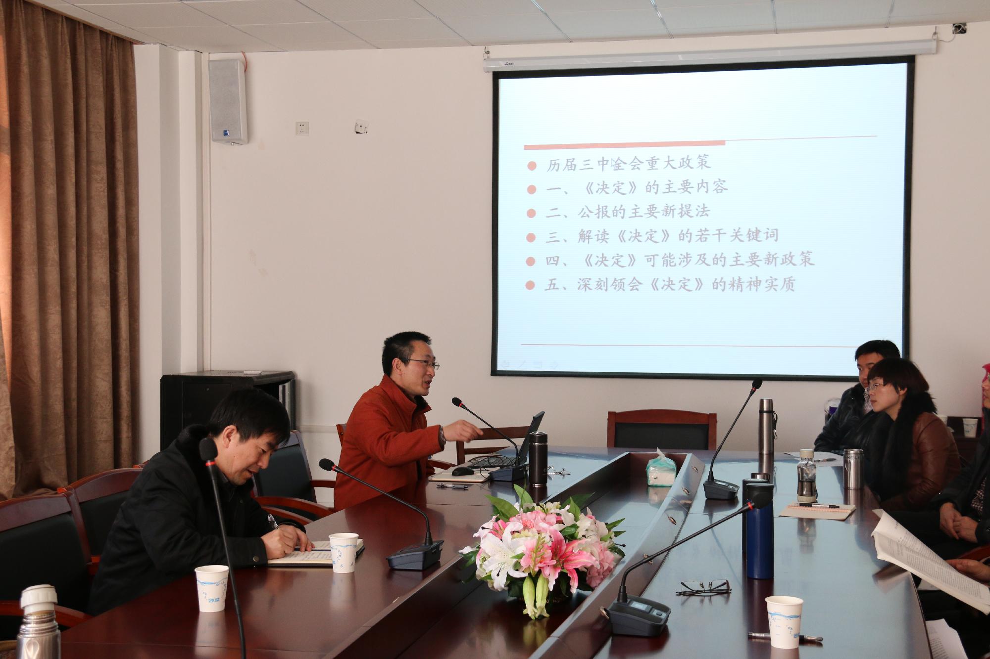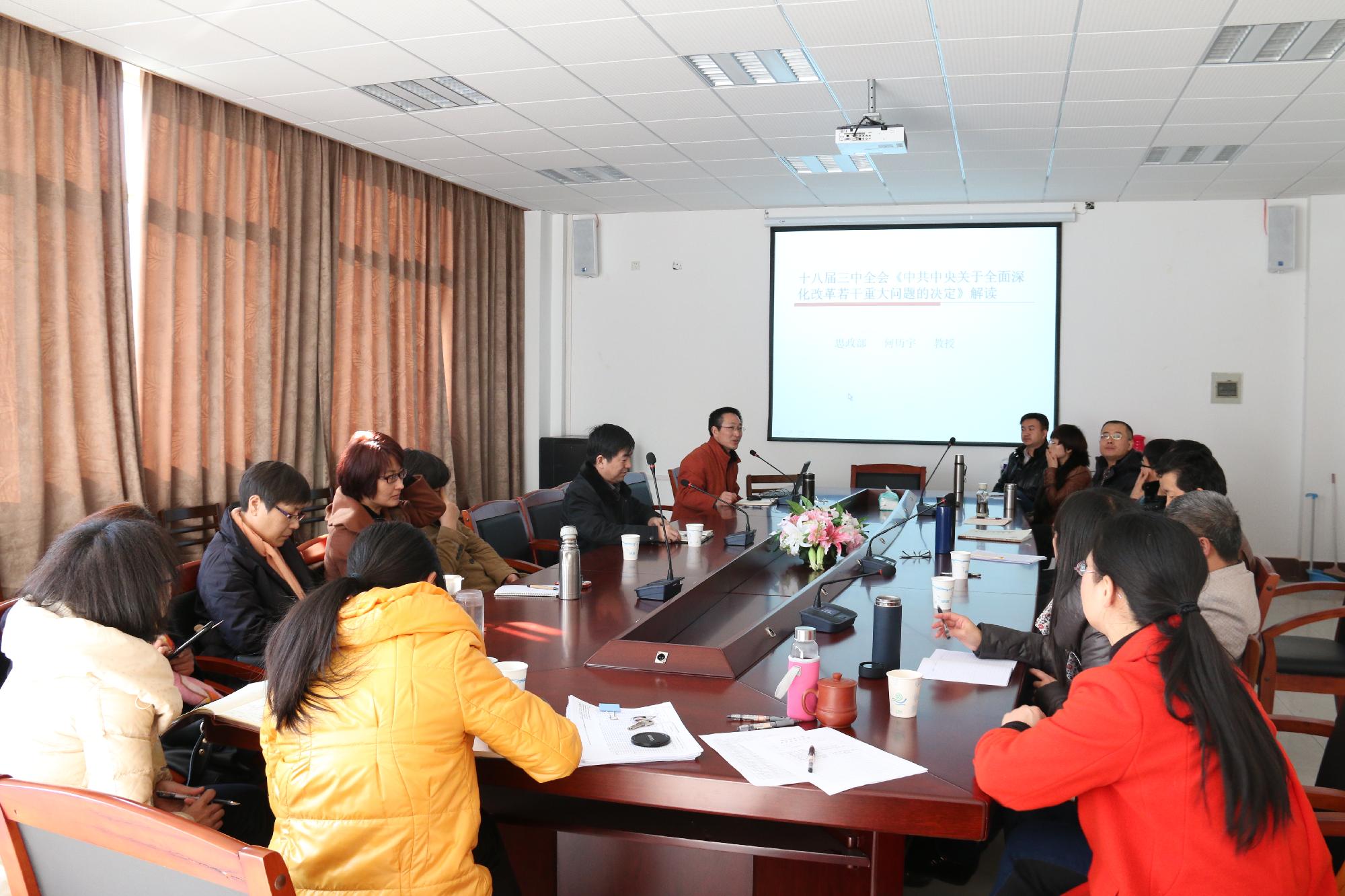 下午,思政部在3号学院楼211会议室召开学习宣传十八届三中全会精神辅导报告会,思政部党总支副书记、副主任何历宇教授作题为十八届三中全会《中共中央关于全面深入改革若干重大问题的决定》解读的报告会,思政部全体教职工参加大会,思政部主任华正学教授主持会议。