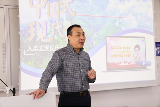 李金昌书记理论联系实际,将个人记忆和民族梦想交织在一起,回顾了中国过去几十年的经济发展历程,以自己作为六零后的亲身经历,讲述了“四个现代化”标语在当时社会的广泛影响,以及这一概念在他心中播下的现代化梦想。他图文并茂地讲解新中国在逆境中科技实力显著提升,当说到原子弹和氢弹的成功研制为中国式现代化的崛起奠定了坚实基础时,同学们不禁为之动容,感慨美好生活来之不易。