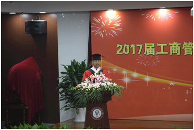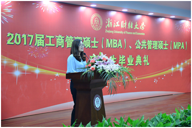 亲友及校友代表、2017届毕业生张丽莉同学的爱人、我院2013届MBA校友、北京大爱城控股地产集团宁波公司营销总监徐晓东先生,在校生代表、MBA联合会主席、慈溪弘正会计师事务所合伙人余丹丹分别在典礼上发言。