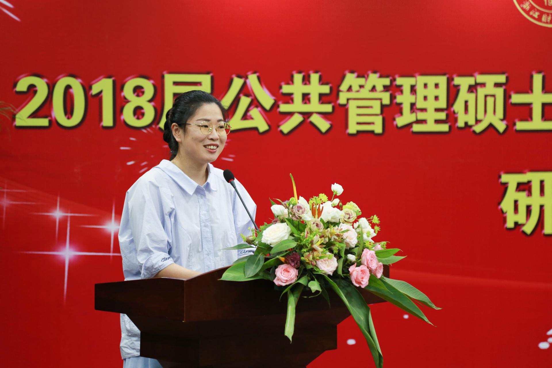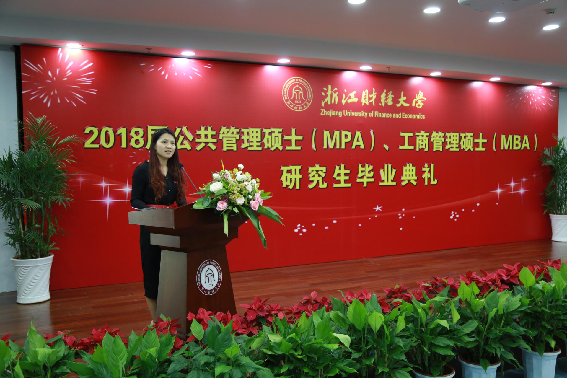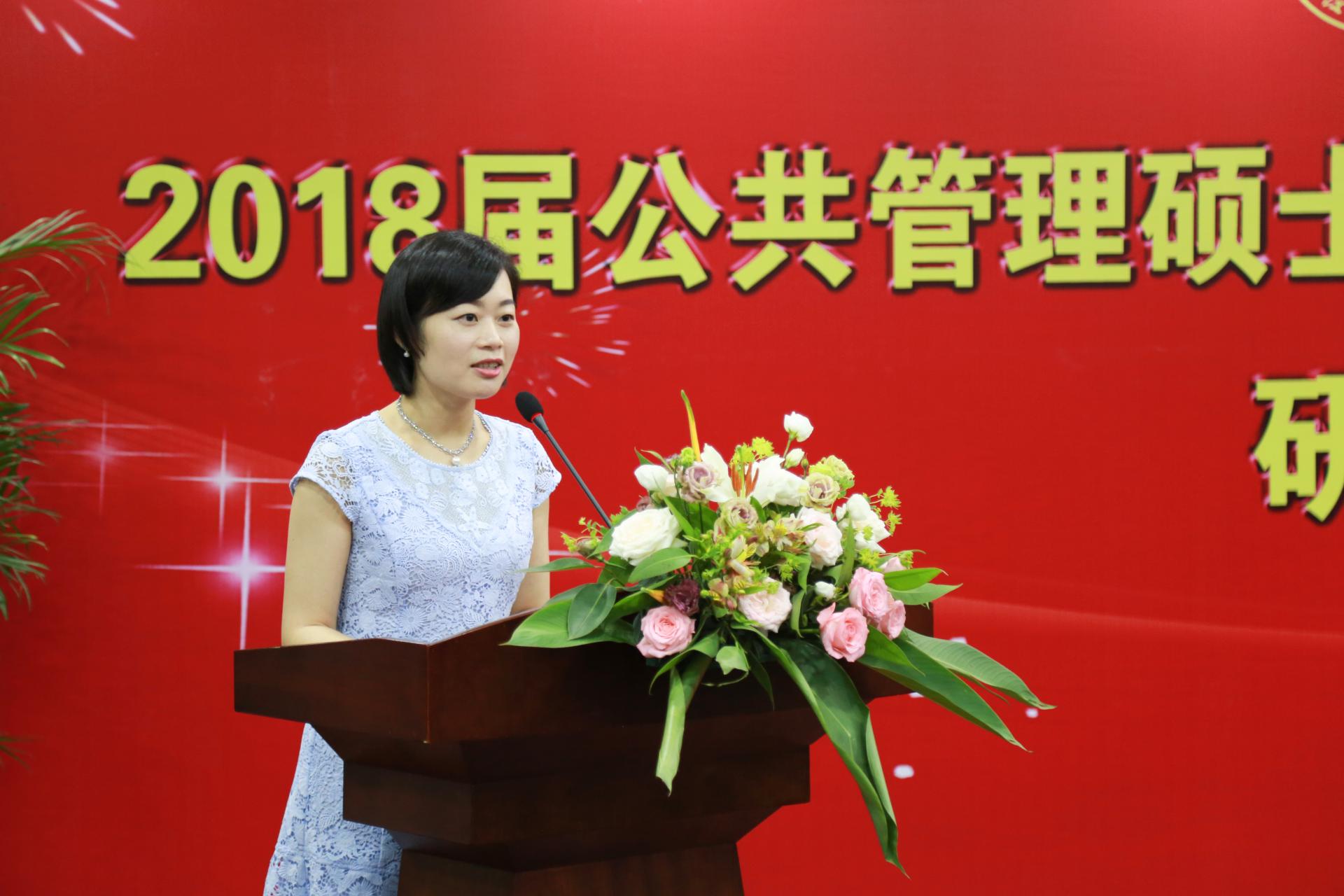 亲友代表、2018届MPA专业陈国正同学家属徐胜丹女士,在校生代表、2017级MPA专业高蓓蓓同学分别在典礼上发言。