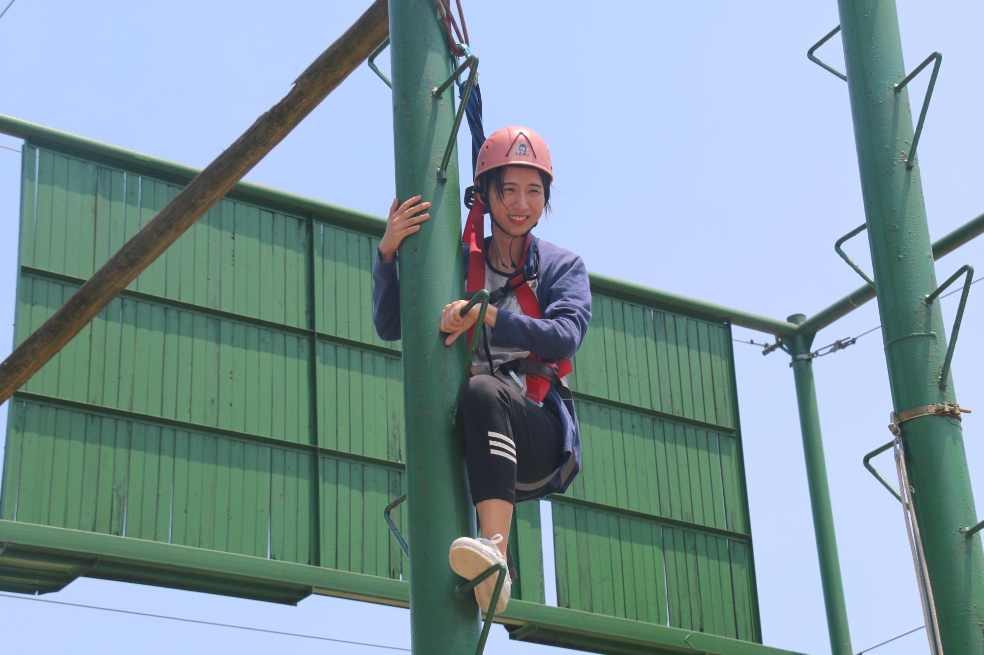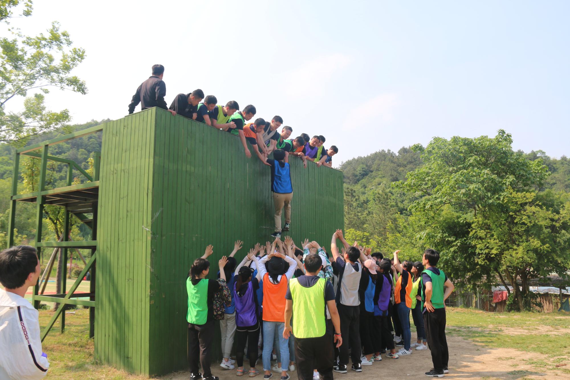 求生墙项目将当天的活动引向高潮。三米多高的90度垂直木板墙,40分钟的限时时间,需要同学们齐心协力,互相配合,甘于奉献,让每一位队员都能翻过高墙。游戏刚开始,大家纷纷觉得“不可能”,“太难了”!但是在教练的引导和同学们的激烈讨论、集思广益后,大家随即制定了高效的攀爬战术,一个接一个有序、安全、迅速地翻越了高墙,仅仅用了20多分钟就完成了翻越!“集众人之力,则无往不胜”,是大家最深切的体会。