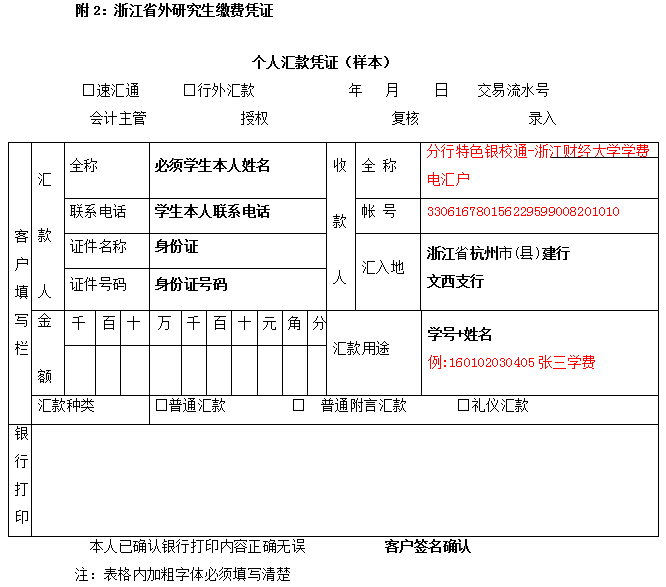 2.浙江省外研究生可于8月1日至8月30日期间就近到当地建设银行对公营业点(分理处或支行以上)办理个人电汇缴费手续,将学费汇入学校的指定帐户内(账号:330616780156229599008201010),汇款人全称和账号必须为本人的姓名和本人学号,凭证填写范本详见附2。