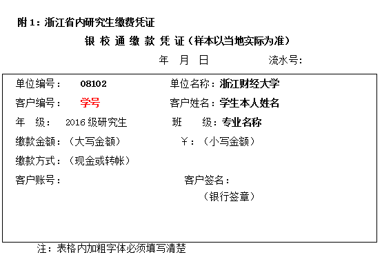 1.浙江省内研究生可于8月1日至8月30日期间就近在本省建设银行的任何一家储蓄网点免费办理缴费手续,在办理缴费手续时向银行柜台人员提供学校代码“08102”,学校名称“ued体育 ”,及本人的学号,办理完毕后,个人请将银行打印并盖好“现讫章”章后的银校通缴款凭证保存好。凭证填写范本详见附1。