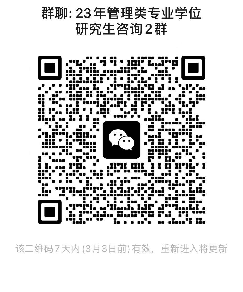 为满足2023年管理类专业学位研究生报考考生对今年相关政策知晓的需求,ued体育 公共管理学院专业学位中心建立了微信群“2023年管理类专业学位研究生咨询群”解答相关政策问题。目前1群已满,特建立2群进行解答。欢迎管理类专业学位的全国考生联系咨询。(已添加1群的考生无需重复添加)