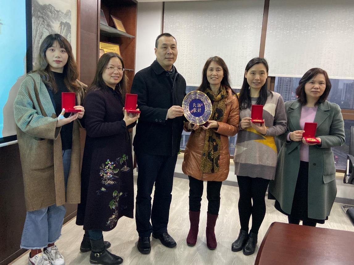 李金昌、黄建新此行还特地为在天平工作的校友送上“浙财氏家”勋章,并现场提笔挥墨送“福”,表达对广大校友的亲切问候和衷心祝福。