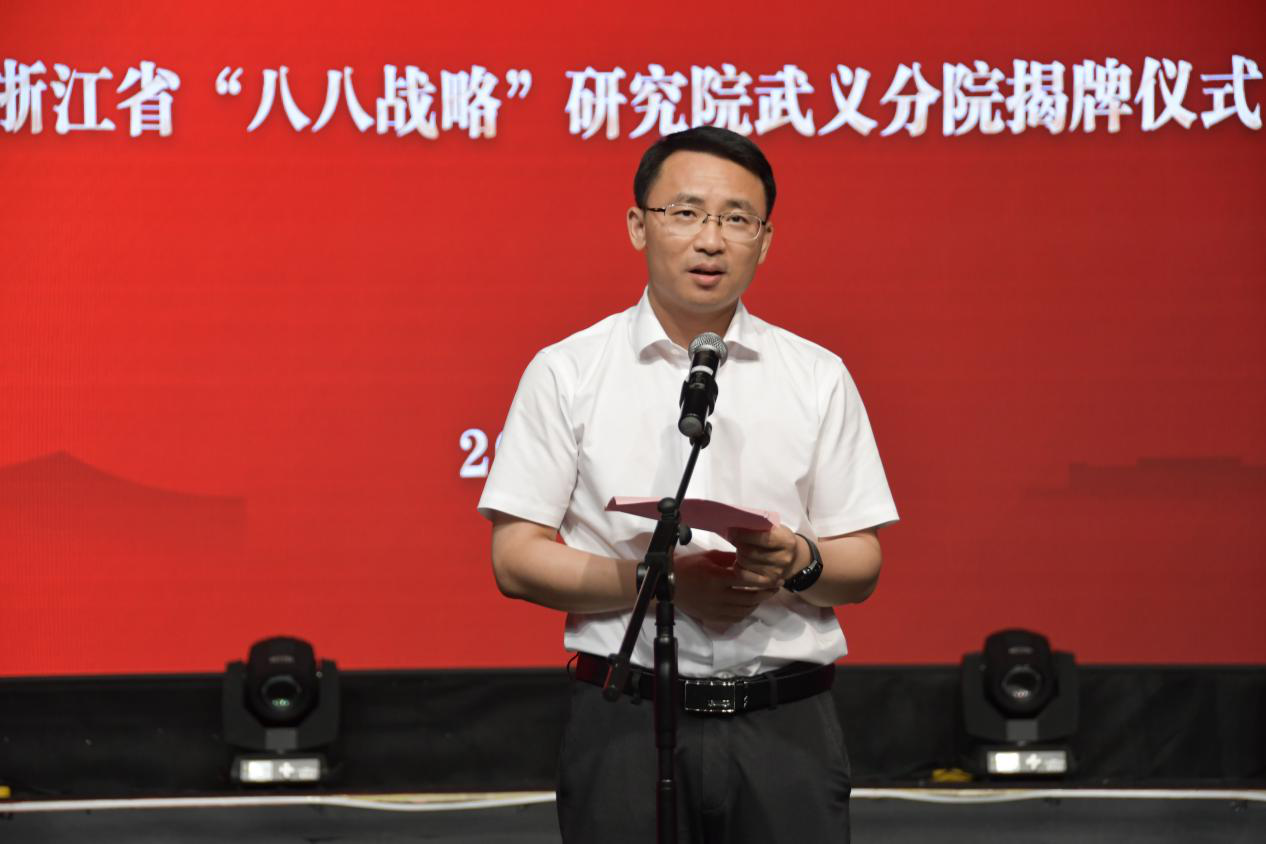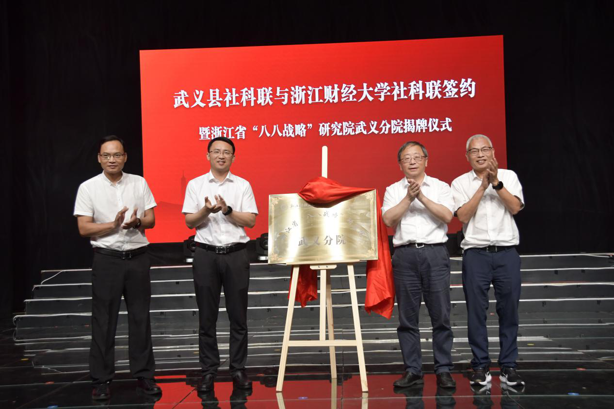 省社科联党组成员、副主席陈先春,校党委副书记、校长、社科联主席钟晓敏,武义县委书记帅朝晖,金华市社科联主席郑春跃共同为浙江省“八八战略”研究院武义分院揭牌
