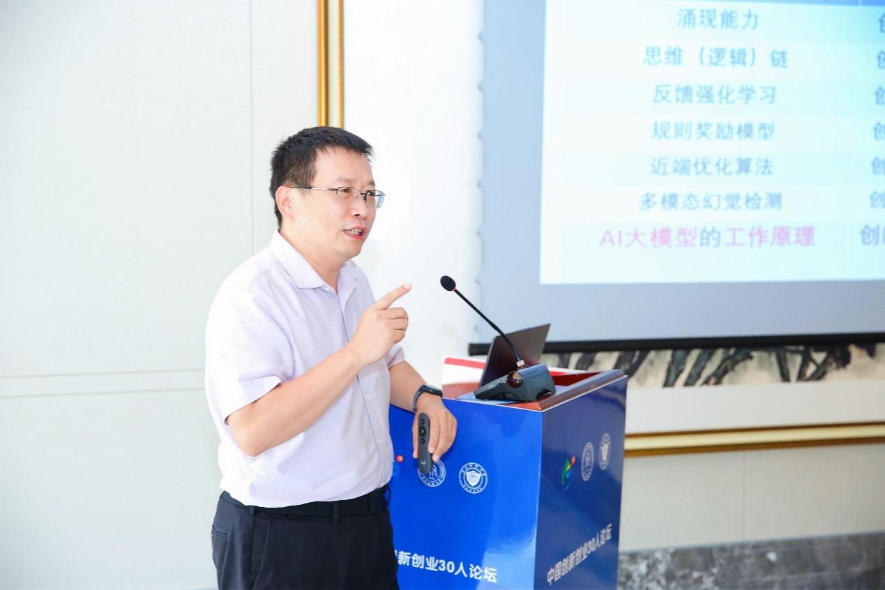 论坛上半场,北京大学路江涌教授与中国科学院大学陈凯华教授分别进行了学术汇报。北京大学路江涌教授以《AI大模型与创新创业》为题作主题演讲。他将AI大模型与创新创业理念作对比,指出AI大模型概念中的涌现能力、思维链、反馈强化学习、规则奖励模型、近端优化算法、多模态幻觉测验分别对应着创新创业理念中的涌现、逻辑、反馈、规则、迭代、试错过程,并围绕这些概念进行了详细的阐述与介绍。最后,他指出两者的工作原理都是由不确定性到确定性的过程。