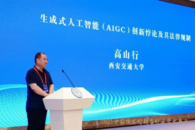 西安交通大学管理学院教授、国家社科基金重大项目首席专家高山行作题为《生成式人工智能(AIGC)创新悖论及其法律规制》的主题报告。高山行教授从AI发展对人类的影响、AI的走向、AI产生的问题及其规制的难点、AI规制的原因与方法、生成式人工智能创新悖论以及关于AI领域创新研究的思考六个方面展开论述。他指出,创新的研究将与更多的学科进行交融,与此同时学科的分类会逐步淡化,而从创新的角度来看AI有利于相关制度的设计。