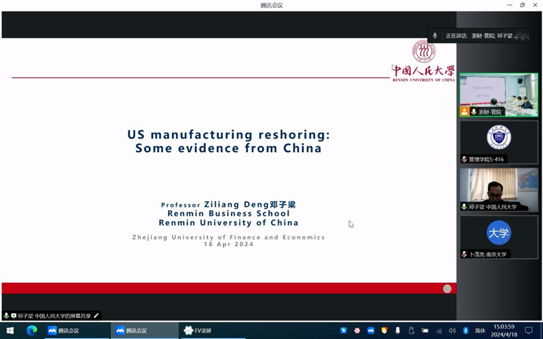 在企业千军万马走出去的时代,国际商务现象不断涌现,为学术研究提供了沃土。为推进学院国际商务学术研究,2024年4月18日下午,我院邀请同济大学经管学院周楠教授、南京大学商学院卜茂亮教授、中国人民大学商学院邓子梁教授以及浙江大学管理学院杜健教授四位演讲嘉宾,邀请南京大学商学院张骁教授作为点评嘉宾,以“线下+线上”的方式成功举办“新时期国际商务研究专题研讨会”。副院长戴维奇教授主持会议。