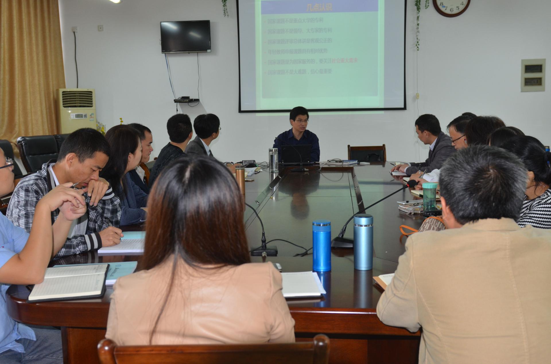 会上,董进才教授从对国家社科基金项目的几点认识入手,向与会老师详细分享了国家社科基金项目申报书的写作要点,包括项目选题、题目设计、研究对象、总体框架、重点难点、研究方法的写作要领。副院长王建明向与会老师分享国家自科基金申报的经验和注意事项,包括要放手做勇敢错;要未雨绸缪;要提高图表颜值和档次;要提高申报书的硬度,要正确对待评审意见等等。