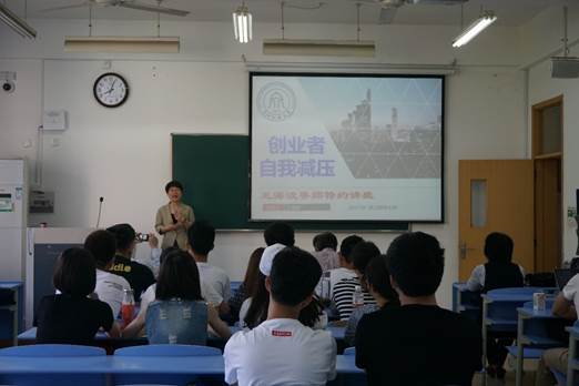 黄其斌同学:许老师总能给予我们惊喜。老师从开学不久便要求我们分组构思自己的项目,上课的形式也更加注重师生之间的互动。如今我们各组的创业项目构思已经到了十分关键的时刻,许老师改变了的传统上课思路,邀请王海波导师为我们带来了一场关于创业者如何自我减压的讲座。从压力是什么到如何进行自我减压,海波导师凭借其十数的培训经验,为我们补全了这块课程中无法获取的知识盲点。