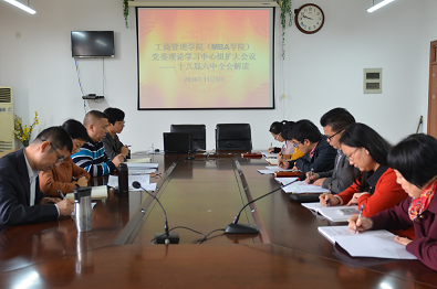 11月1日上午,工商管理学院(MBA学院)党委理论学习中心组在学院楼410会议室举行本学期第三次学习(扩大)会议,参加对象除了学习组成员,还包括各支部书记、办公室主任等,主要学习、解读中共十八届六中全会精神。工商管理学院(MBA学院)党委书记黄卫华首先传达并解读了十八届六中全会精神,对十八届六中全会出现的新变化、新提法做了重点解读,参加学习的各位成员,也结合自己的理解,交流了自己的学习心得和感想。