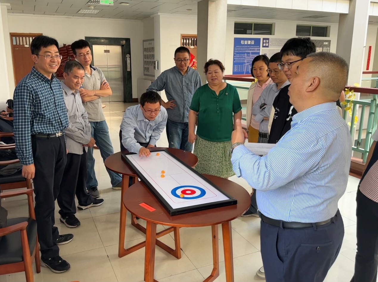 桌面冰壶项目中,学院领导和老师在一块小小的桌面冰壶场地上大展身手。比赛开始前,参赛选手轮流上场,亲手体验并互相分享技巧心得。比赛开始后,参赛选手迅速进入比赛状态,赛场精彩纷呈,现场喝彩欢呼声音持续不断。