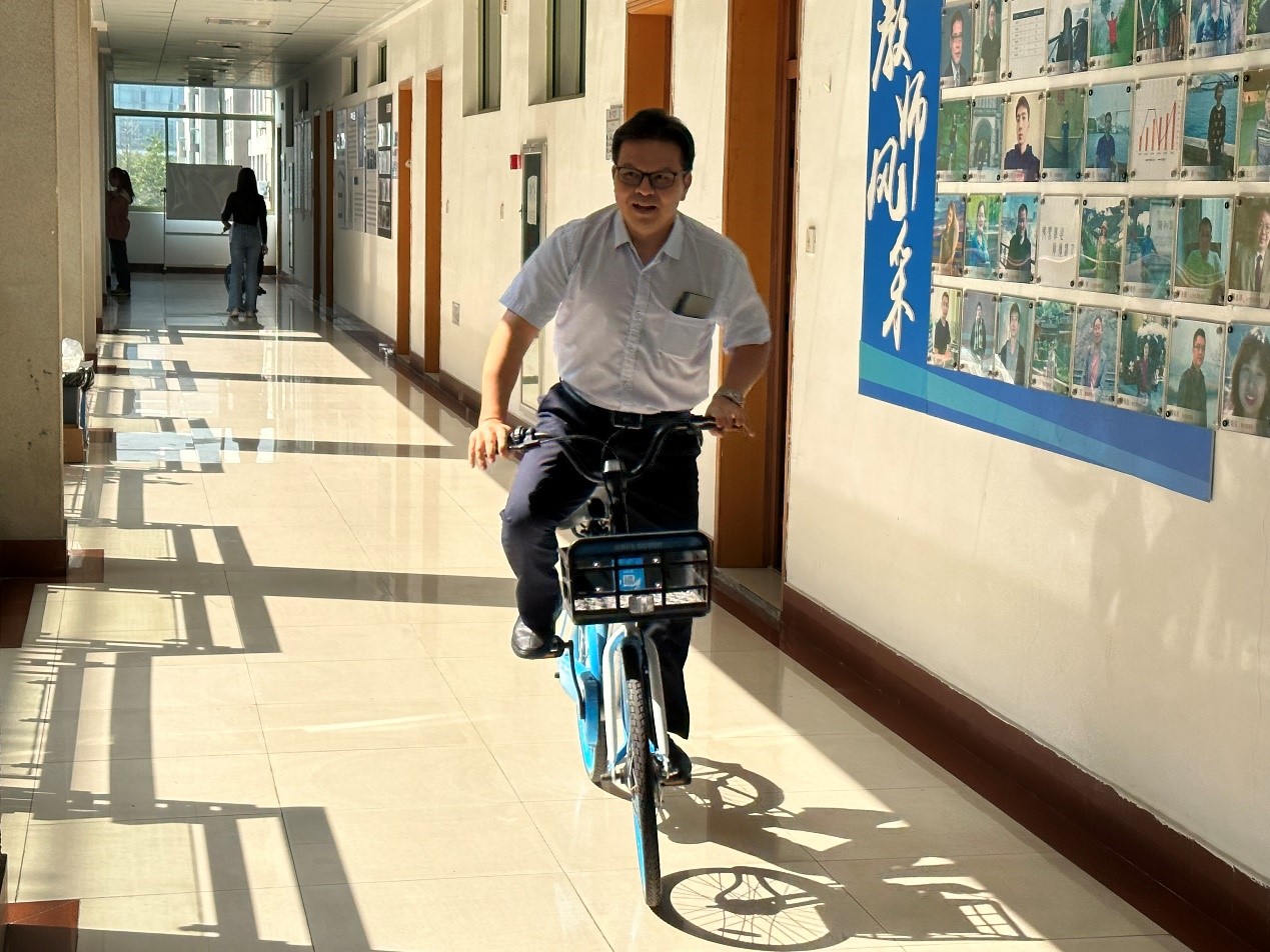 在慢骑自行车项目中,老师们在楼道里比拼谁骑到终点所花费的时间更长。由于双脚不能下地,在缓慢的骑行中老师们为了保持平衡竭尽全力,为了加长自己前进的距离,老师们不断扭转车头,有时也会因为方向难以把握而撞在墙上,现场气氛轻松且热烈,笑声回荡在整个楼层。