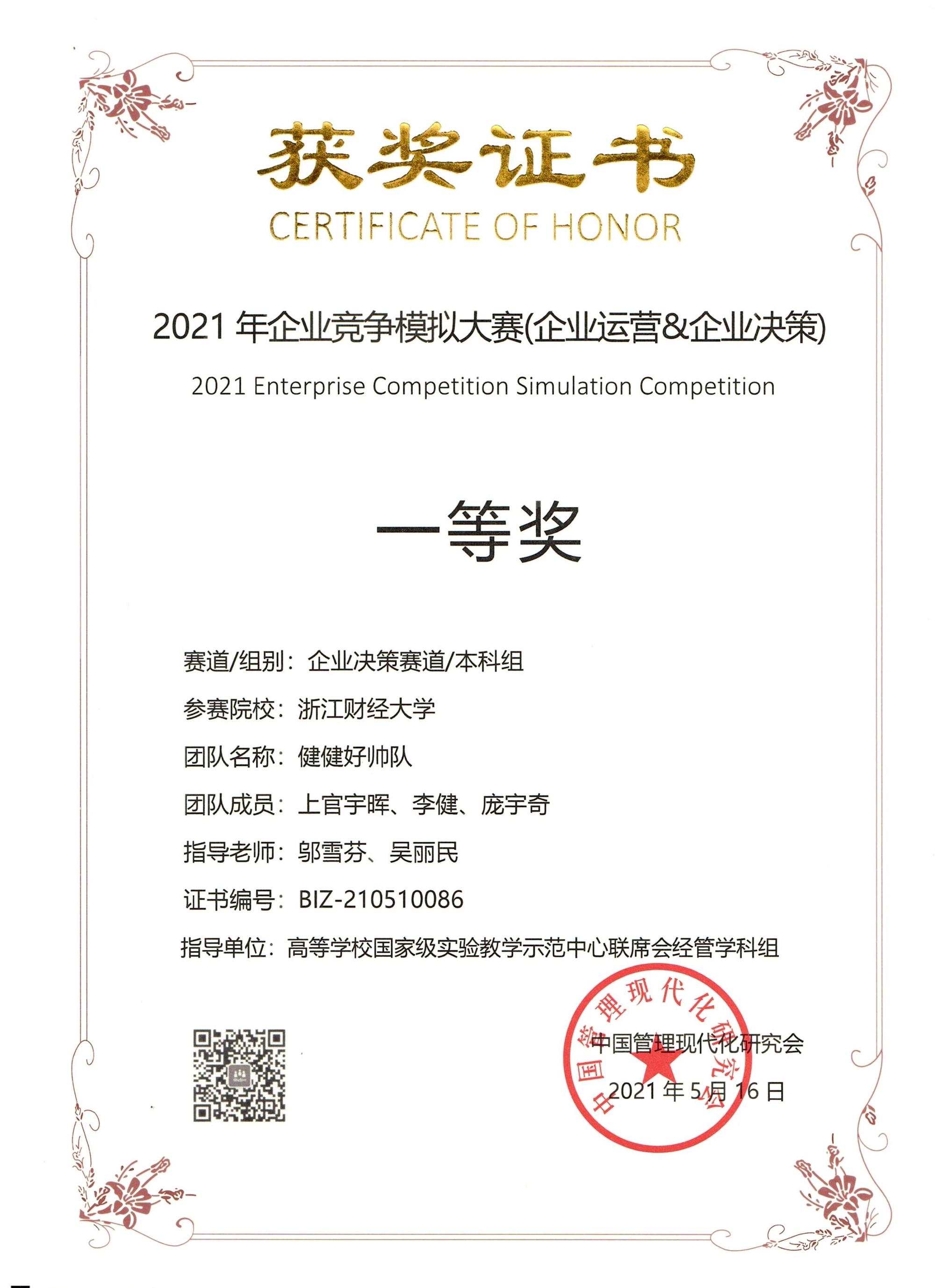 ued体育 在本次比赛中获得一个一等奖,两个三等奖,邬雪芬,吴丽民指导的“健健好帅队”组员为上官宇晖,李健,庞宇奇获得全国企业竞争模拟大赛总决赛的的一等奖。林与川老师指导的“发发发队”,组员为张振芸,楼书扬,朱裕会;裴玲玲老师指导的“Bluffing”,组员为吴梓旗,韩海鹏,孙梓娟分别获得三等奖。