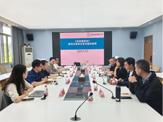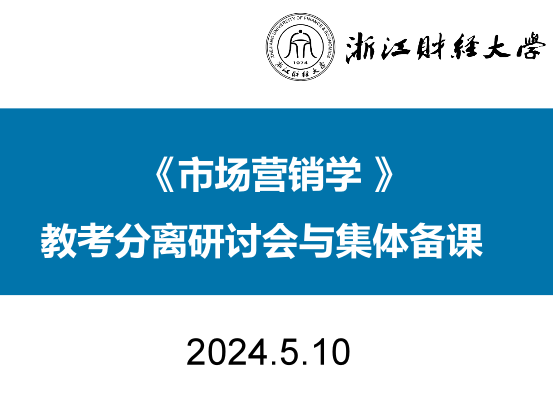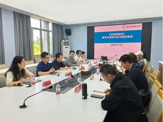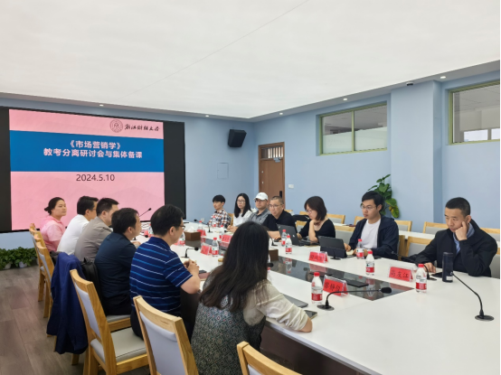 《市场营销学》课程组于2024年5月10日在管理学院楼416会议室顺利召开《市场营销学》课程教学研讨会。本次课程研讨会主题为:教考分离与《市场营销学》集体备课。规划《市场营销学》课程教考分离行动方案和集体备课将教考分离落到实处。本次课程研讨会旨在响应学校的“新财经战略”中的新培养体系建设。推进学校教育教学管理改革,完善教学管理制度,客观、公平、公正地评价教学效果,更好地发挥考试有效检验和提升教学质量的杠杆作用,提高本科教学水平和人才培养质量。研讨会邀请了浙江树人大学管理学院市场营销系主任、市场营销专业负责人曾锵教授和绍兴文理学院商学院企业管理系主任赵江副教授参加。研讨会由《市场营销学》课程负责人郭军灵副教授主持,《市场营销学》课程组11位专业老师参加了会议。
