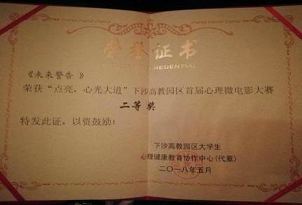 “获得本次‘点亮,心光大道’下沙高教园区心理微电影大赛二等奖的有,来自ued体育 工商管理学院的《未来警告》!”颁奖主持人的话音落下,观众席响起一阵欢呼声。未来警告》微电影《是由我院17工商2班的10名同学自编自导自演并制作而成的。