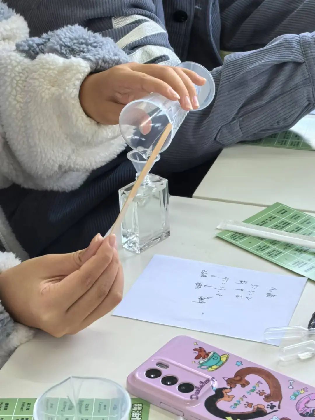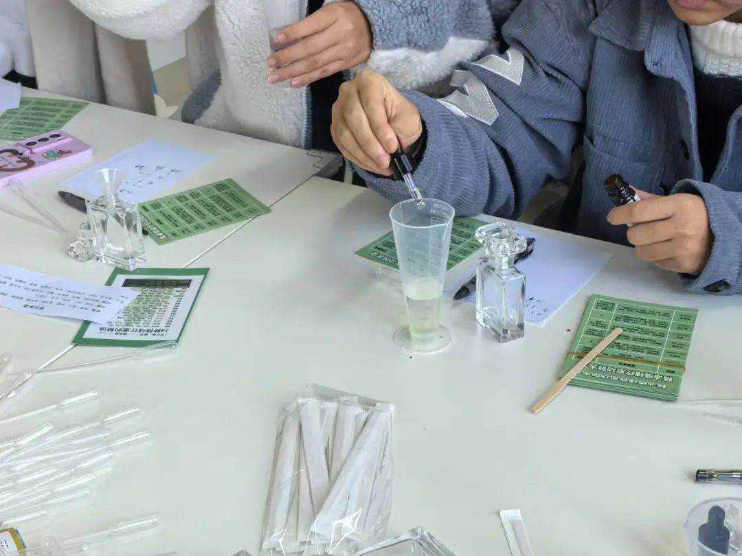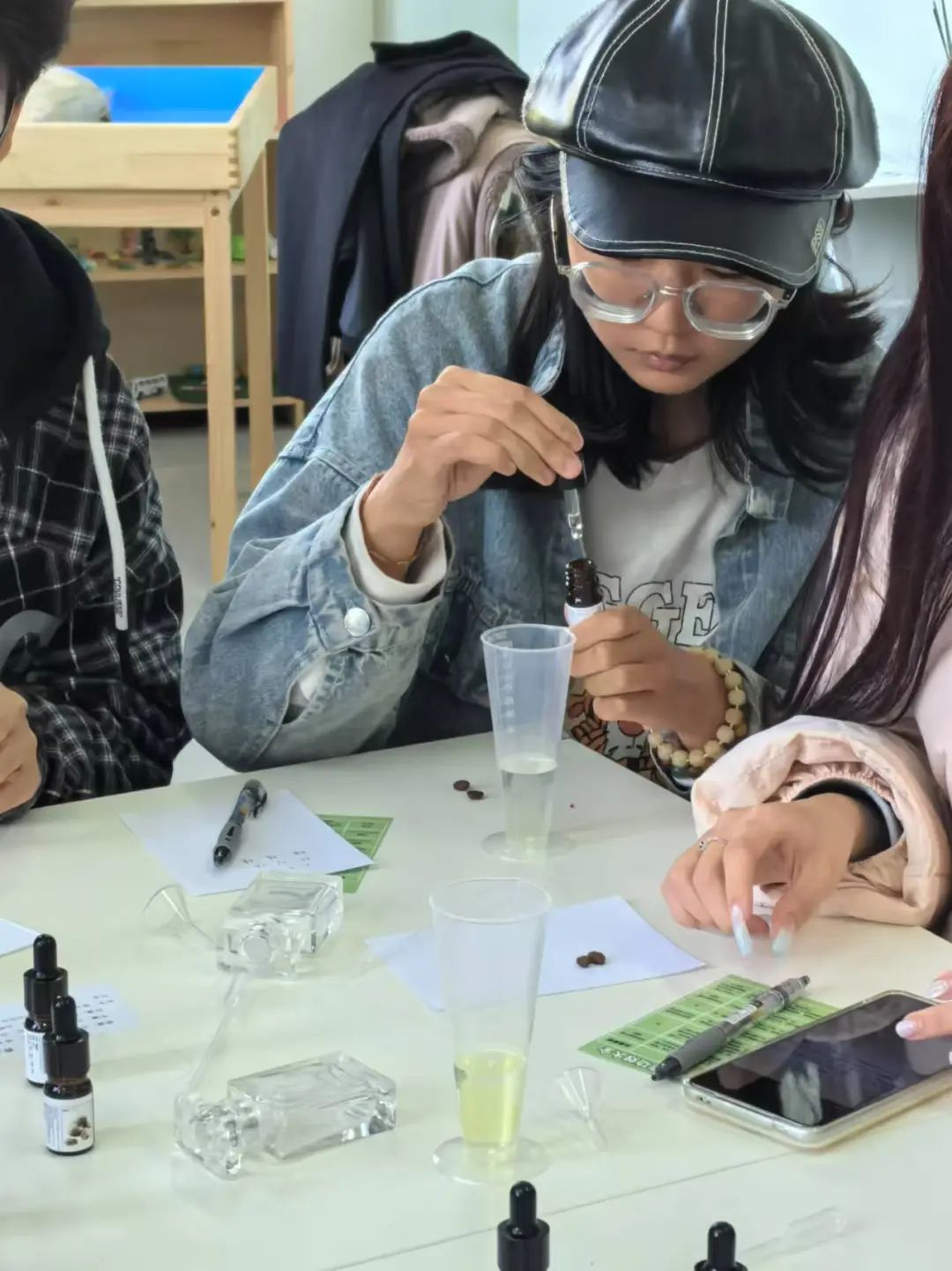在老师的指导下,依托同学们对情绪的理解,选择了符合情绪状态的和个人审美的香油,按照前中后调特定的5:3:2的比例,选择自己喜欢的味道或符合自己情绪的精油进行调配,调制出一款适合自己的香水,最后装入香水瓶,并为自己的香水取名。