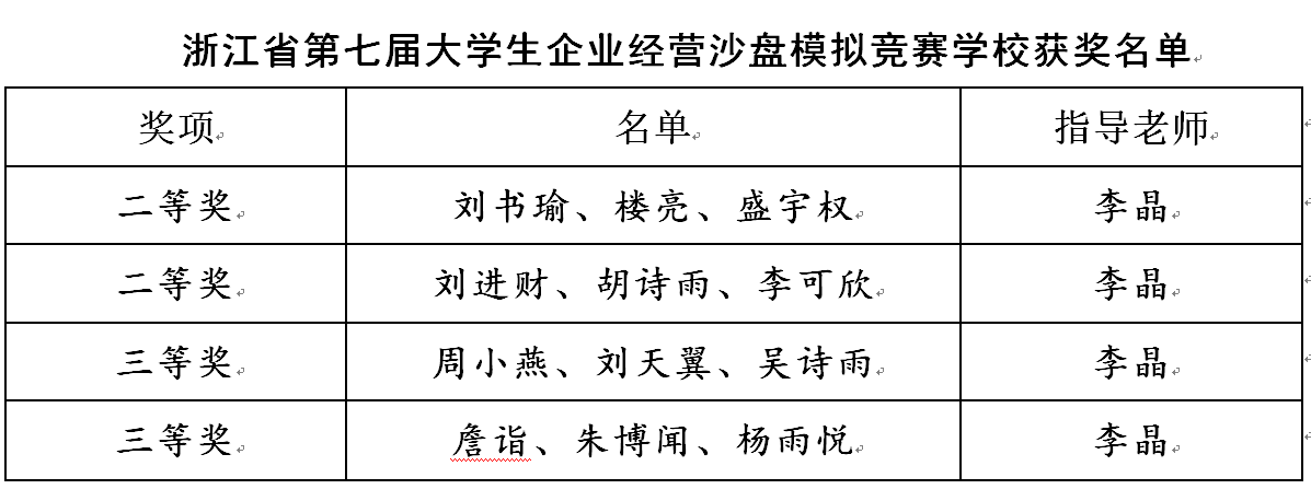 10月30日,浙江省“新道杯”第七届大学生企业经营沙盘模拟竞赛(本科组)在绍兴落下帷幕。我校有5支代表队伍参赛,获得二等奖2项、三等奖2项。