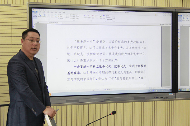 叶舟主任首先传达了在入选省属重点建设大学和“申博”成功背景下学校2018年度的重点工作和目标任务,介绍了李书记和钟校长在中层干部会议上发言的概要内容,然后针对部门特点,强调了以“最多跑一次”为外在体现,服务优先、效率优先、完善制度为主旨的中心服务改革目标,并结合2017年度的中心服务问卷调查结果,要求下属各部门针对薄弱环节进行改良,提升服务效率与服务质量,继续梳理各项业务,尽可能放在网上办事大厅办理。最后重点部署了2018年度的经管实验中心任务,将致力于建设大数据实验室、谋划高水平实验教学平台、推出云桌面、建立实验教学质量评价体系等几项重点工作,助力推进学校的“双一流”建设。