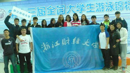 我校游泳代表队一行共18人,分为甲乙两组参加了本届比赛。赛前在左宇飞和严蓓两位教练的科学指导下,放弃了大量的休息时间,进行了艰苦的集训和备战。赛中面对各支劲旅,奋力拼搏,迎难而上。经过四天奋战,将财大学子的拼搏精神书写在赛场上,不但获得了50米自由泳(阙天成)和50米蝶泳(徐家晖)的2块金牌,还获得了其他项目的8块银牌和1块铜牌,同时获得了甲组团体总分第三名、甲组男子团体总分第二名、甲组女子团体总分第四名和乙组男子团体总分第四名的好成绩。