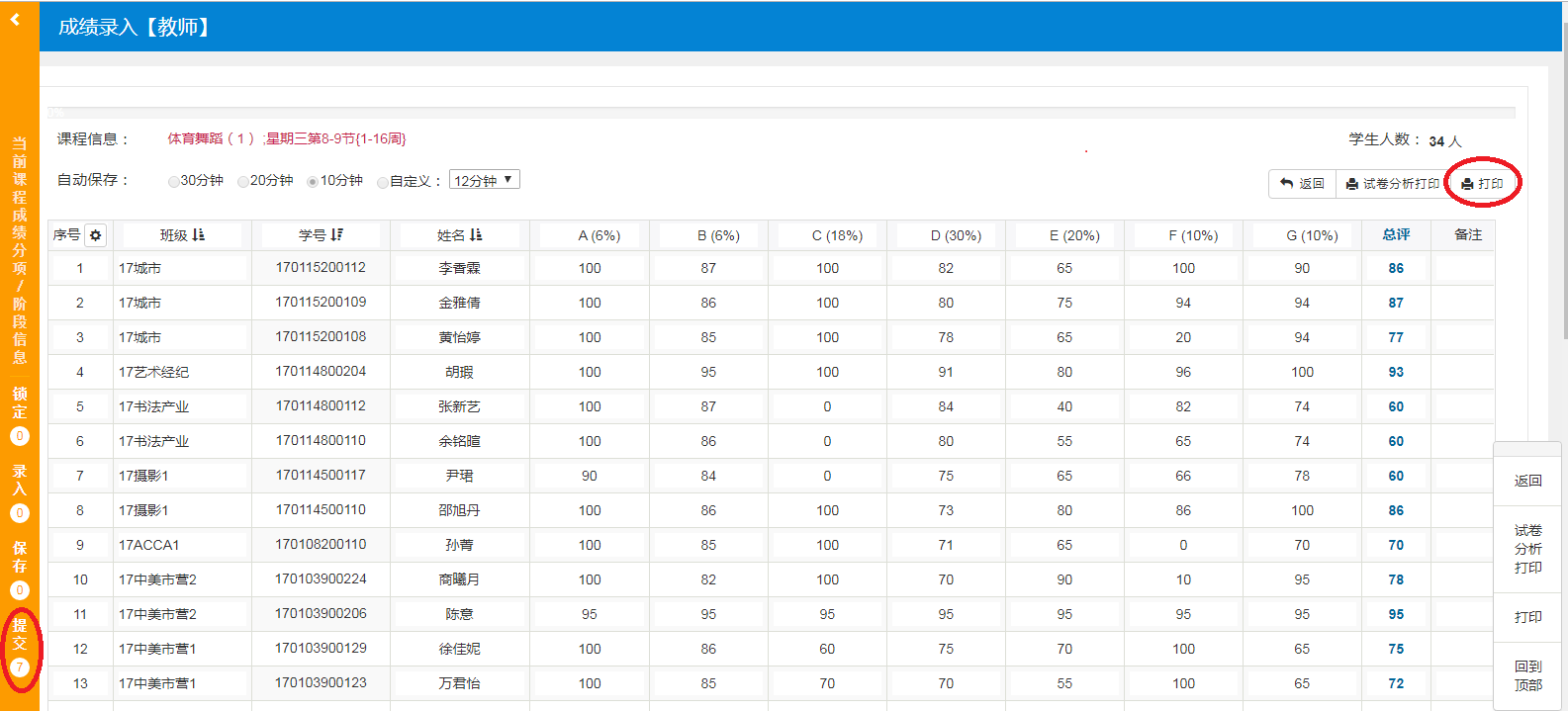 6、输完成绩后,点击左边【提交】,并点击右上角【打印】-【输出】-【Excel】-【原样导出】保存电子稿,发送至tyb@zufe.edu.cn