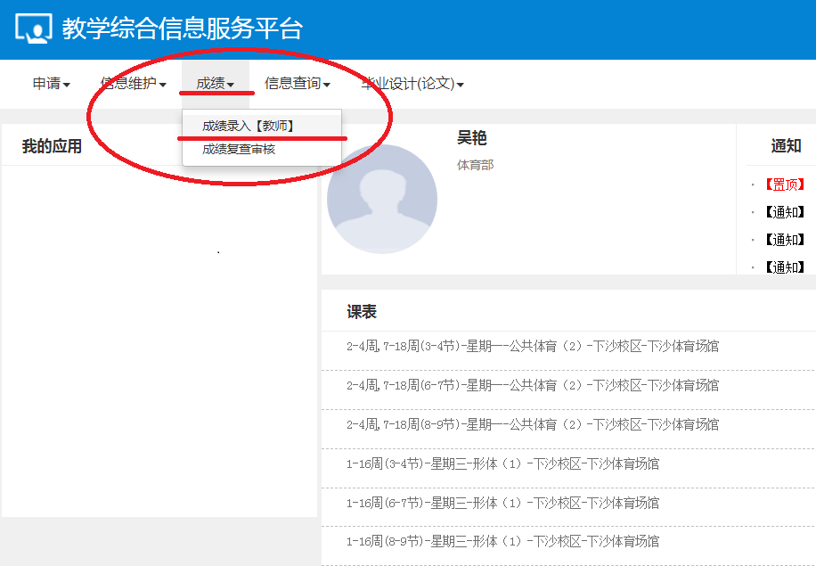 (1)信息门户—我的应用—教务系统-教师端—成绩—成绩录入(教师);