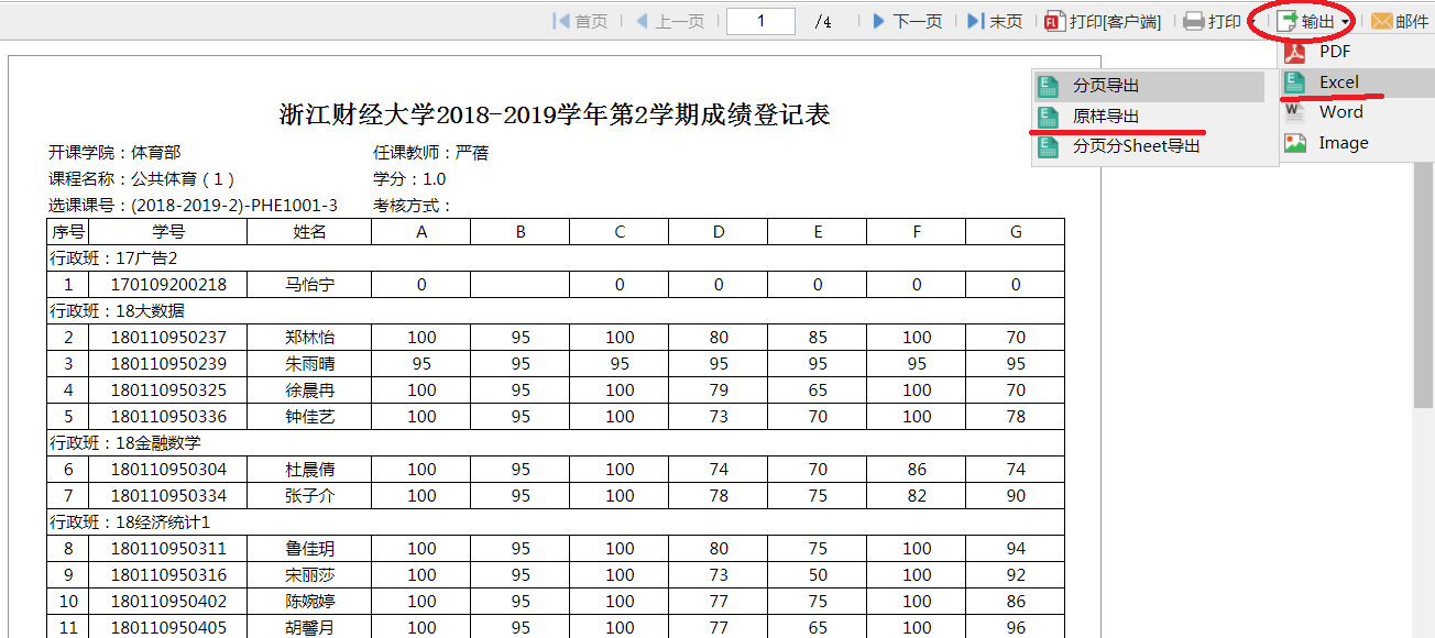 3、成绩输出:成绩录入完毕后,请按成绩管理要求进行成绩输出保存。点击右上方【打印】-【输出】-【Excel】-【原样导出】)并将成绩电子稿发至部门邮箱:tyb@zufe.edu.cn(请务必将电子稿成绩发至邮箱)