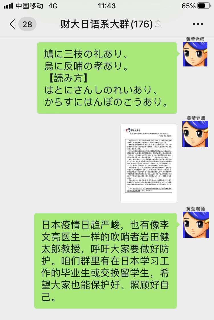 “山川异域,风月同天”、“青山一道同云雨,明月何曾是两乡”,如果文字界也有网红,那么和救援物资一并从日本送来的诗词就是时下最流行的美丽语言。黄莹作为日语系的一名教师,一直在思考“不是医护人员的我,可以为战疫做点什么”,而她坚信为日语专业的学生正确解读好日本传来的讯息是力所能及也是理所应当的工作。同时,黄莹老师关注并分享华人在日本的善举,希望让学生们懂得“人人为我,我为人人”的道理,让学生们了解疫情没有国界,我们必须携手并进,让学生们树立正确的世界观、人生观和价值观。