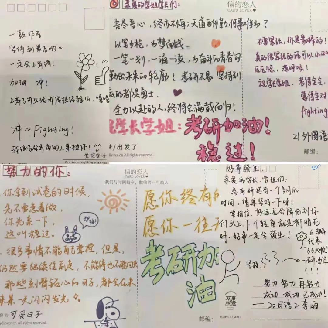 最后,学院领导为考研学生逐一发放慰问礼品。为考研学子准备的牛奶,寓意牛气冲天,万事顺意;考试文具套装,寓意蟾宫折桂,金榜题名。还有来自学弟学妹们的祝福明信片,承载着学弟学妹们语你同行,逐梦远航的心意。