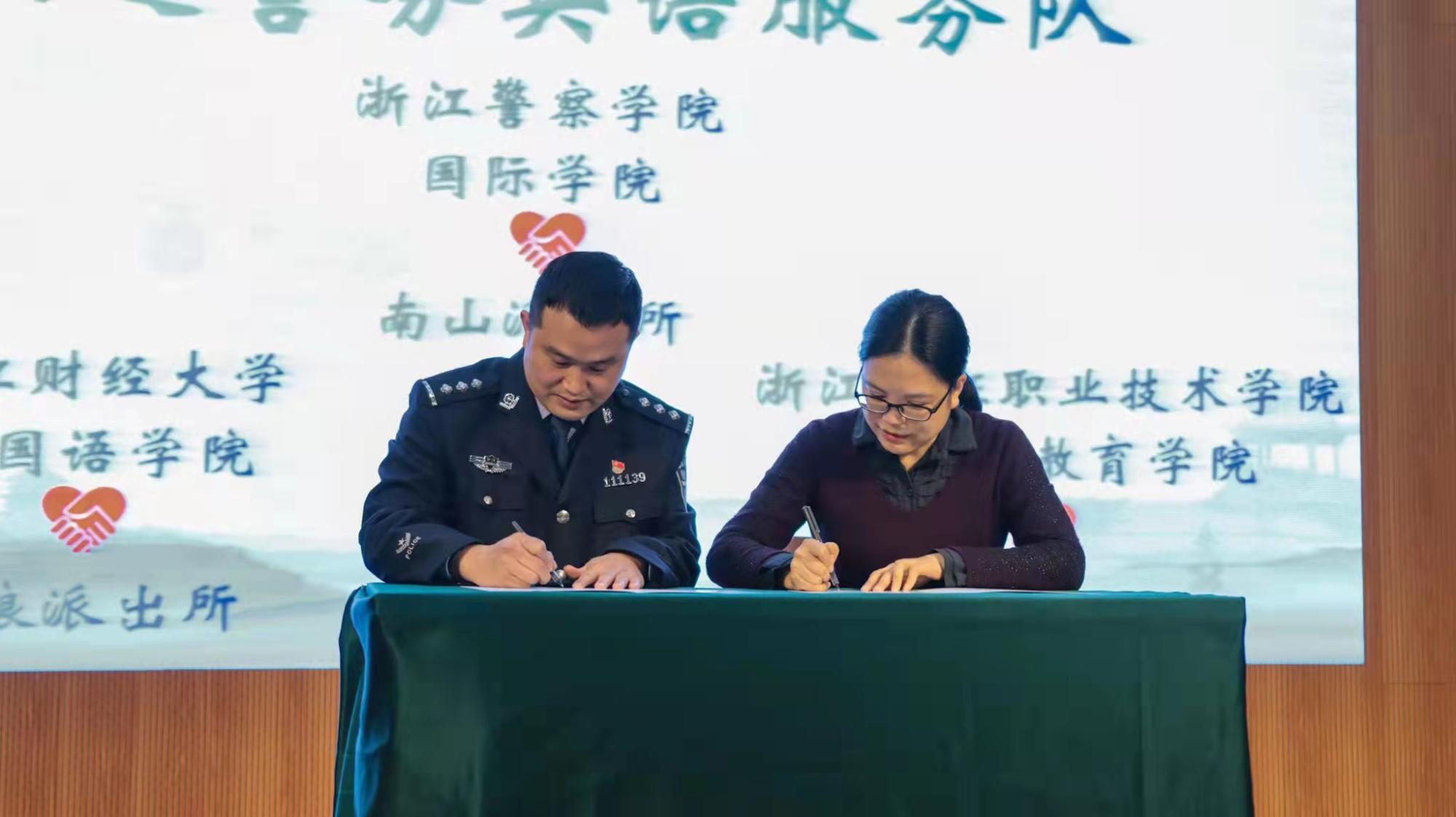 外国语学院作为警务英语共建高校和志愿合作单位之一,与杭州市公安局西湖风景名胜区分局建立共建合作,学院党委副书记李颂代表学院签订合作协议,与会的两个党支部与柳浪派出所建立点对点精准帮扶,学院将为景区警务工作提供必要的语言服务支撑,双方还将围绕专业实习、实践服务等方面开展深层次合作。
