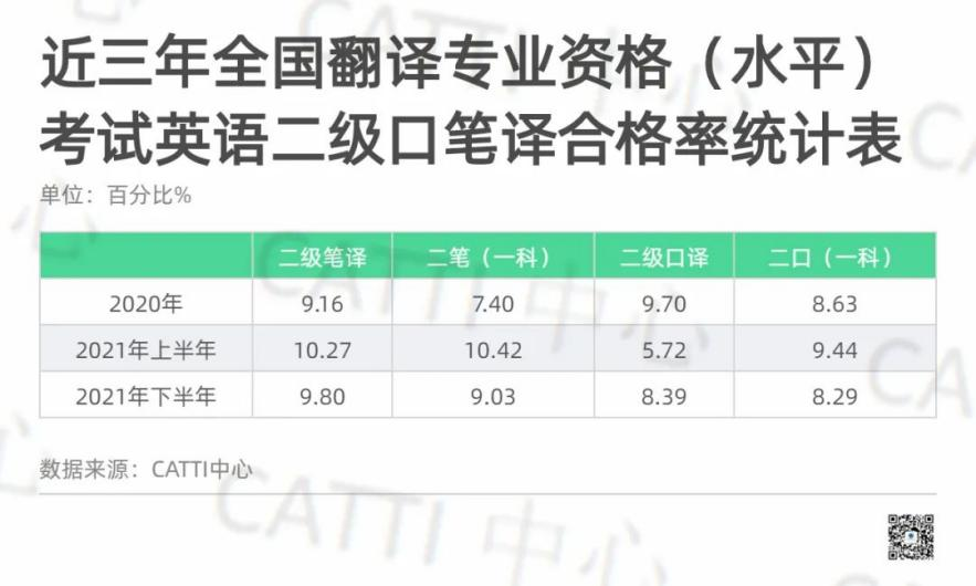 CATTI是受国家人力资源和社会保障部委托,由中国外文出版发行事业局负责实施与管理的一项国家级职业资格考试。已纳入国家职业资格证书制度,是一项在中国实行的、统一的、面向全社会的翻译专业资格(水平)认证,是对参试人员口译或笔译方面双语互译能力和水平的评价与认定。二级笔译考试全国通过率长期维持在10%左右,考生以专业从业人员为主,对在读本科生来说,难度很高。考生需同时通过《笔译综合能力》和《笔译实务》2门考试。《笔译综合能力》相当于英语专业八级水平,侧重于检测考生的英语语言基础。《笔译实务》要求考生在180分钟内翻译共约900词的2段英文文章和共约600字的2段汉语文章,时间紧、任务重、难度高。通过二级笔译考试,相当于获得翻译系列中级职称。