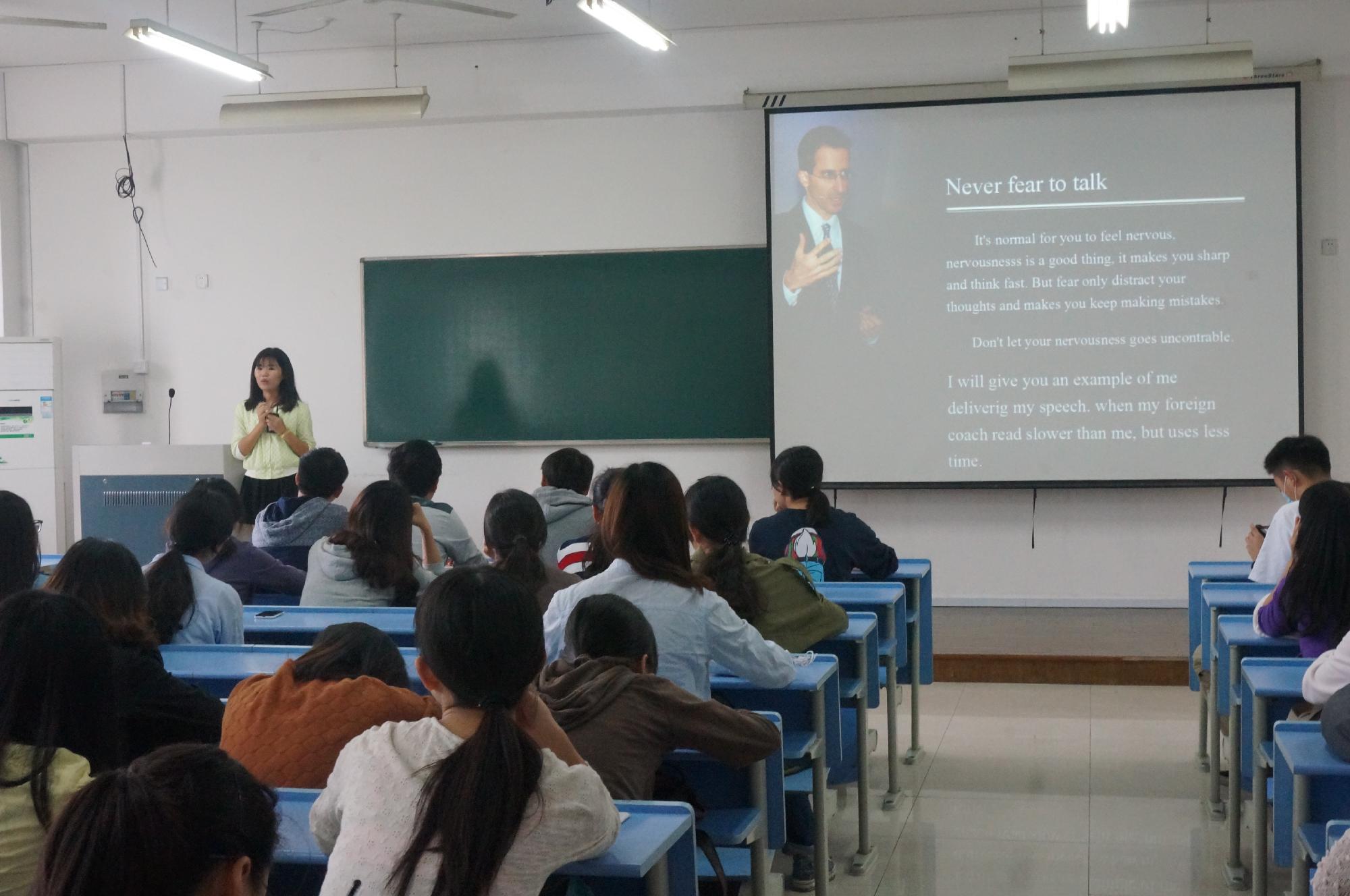 10月28日下午1:30,主题为“如何提高英语口语”的外国语学院特色朋辈课堂在A305教室开课。本次课堂由我院2011级英语专业的吴晨主讲。吴晨专业成绩优异,在英语口语应用方面颇有心得,不仅多次参加英语演讲比赛并取得丰硕成果,并具有丰富的英语专业志愿服务经历。