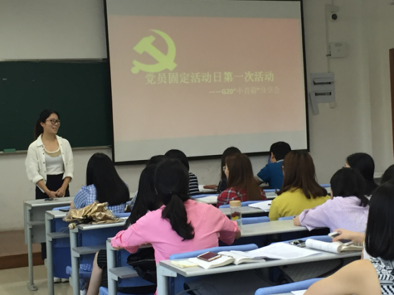 9月20日下午3点,我院全体学生党员在学院楼8206教室召开本学期“党员固定活动日”第一次活动。本次活动请到陈兰娟、王迷迦和成斯施三位预备党员同志与大家分享作为G20峰会志愿者“小青荷”的工作经历和感悟。