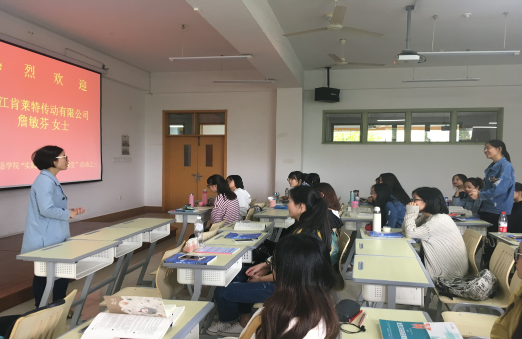 2017年10月19日上午,我院商务英语专业15级“实践基地精英进课堂”活动如期举行。此次课堂邀请到了商务英语专业校外实践基地浙江肯莱特传动有限公司外贸部经理詹敏芬女士作为主讲嘉宾。商务英语系副主任孙久荣老师担任主持人,教学办庞伟慧老师和商务英语系刘明老师应邀参加活动。