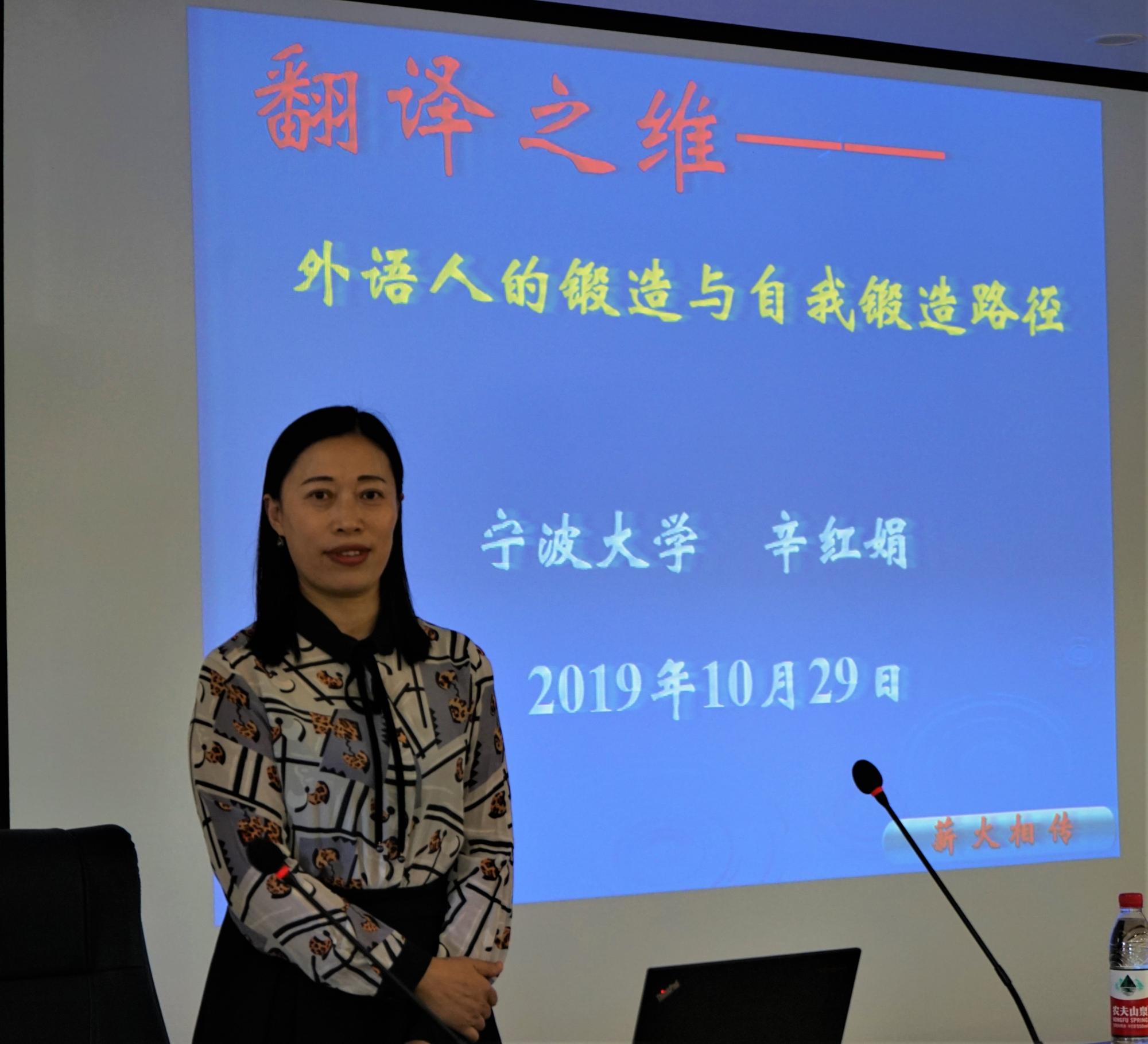 2019年10月29日,宁波大学辛红娟教授应邀来我院作题为“翻译之维:外语人的锻造与自我锻造路径”的学术讲座。此次讲座由院长黎昌抱教授主持,学院相关老师和全体研究生参加了此次讲座。