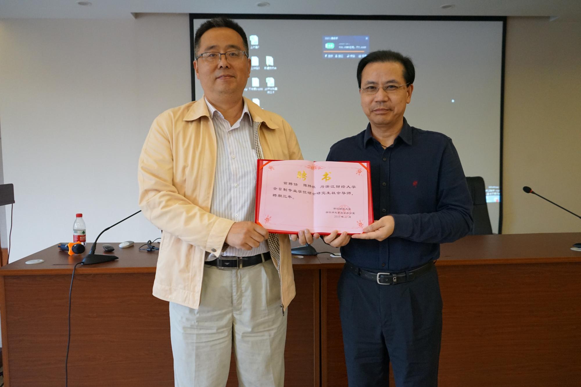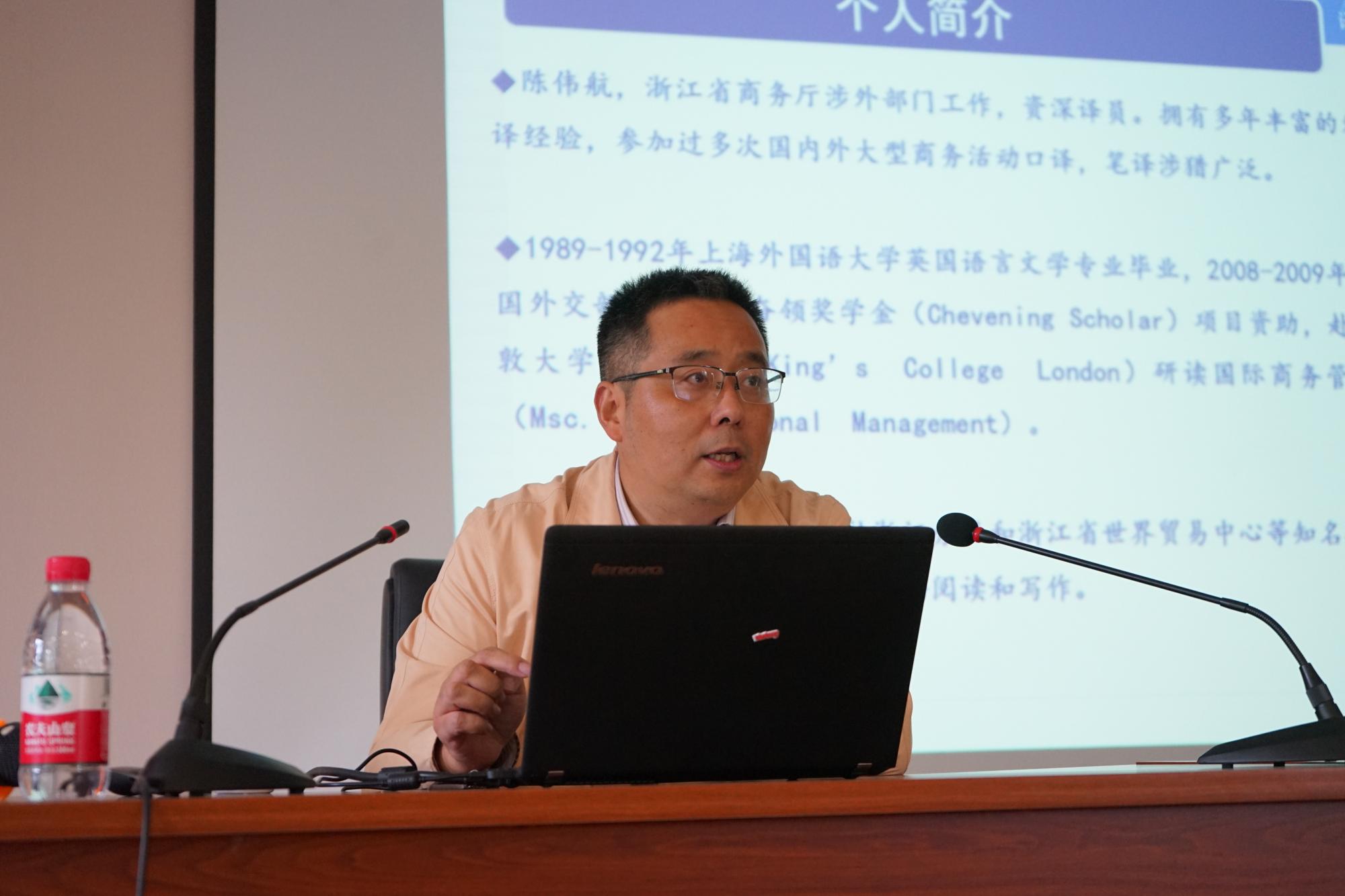 10月13日下午,浙江省商务厅国际投资促进中心对外投资部陈伟航部长应邀来我院作题为“译路相伴:翻译职业学习实践心得”的讲座。黎昌抱院长向陈伟航部长正式颁发了ued体育 校外翻译专业硕士研究生指导教师聘书。