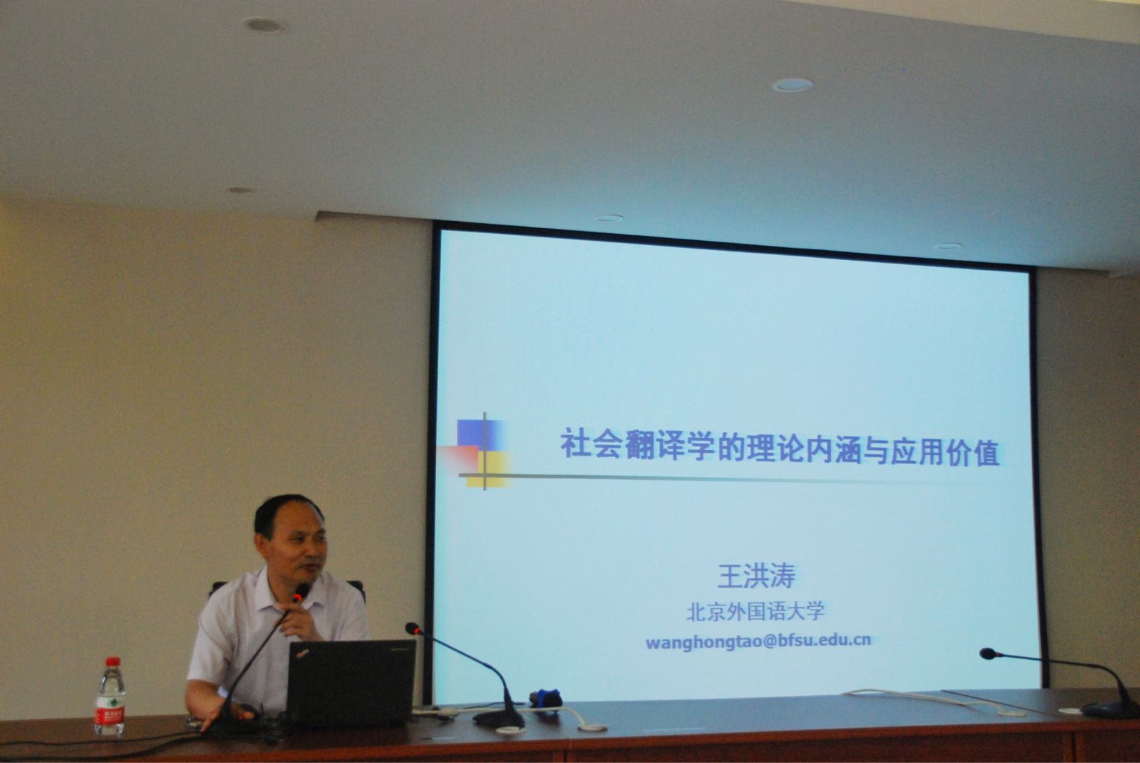 2018年5月10日下午,北京外国语大学英语学院王洪涛教授应邀于我院108报告厅开展以“社会翻译学的理论内涵与应用价值”为题的专题讲座。讲座由副院长邵斌教授主持,院长黎昌抱教授、党委书记章汝雯教授、副院长曹道根教授以及学院相关教师与研究生参加了本次讲座。