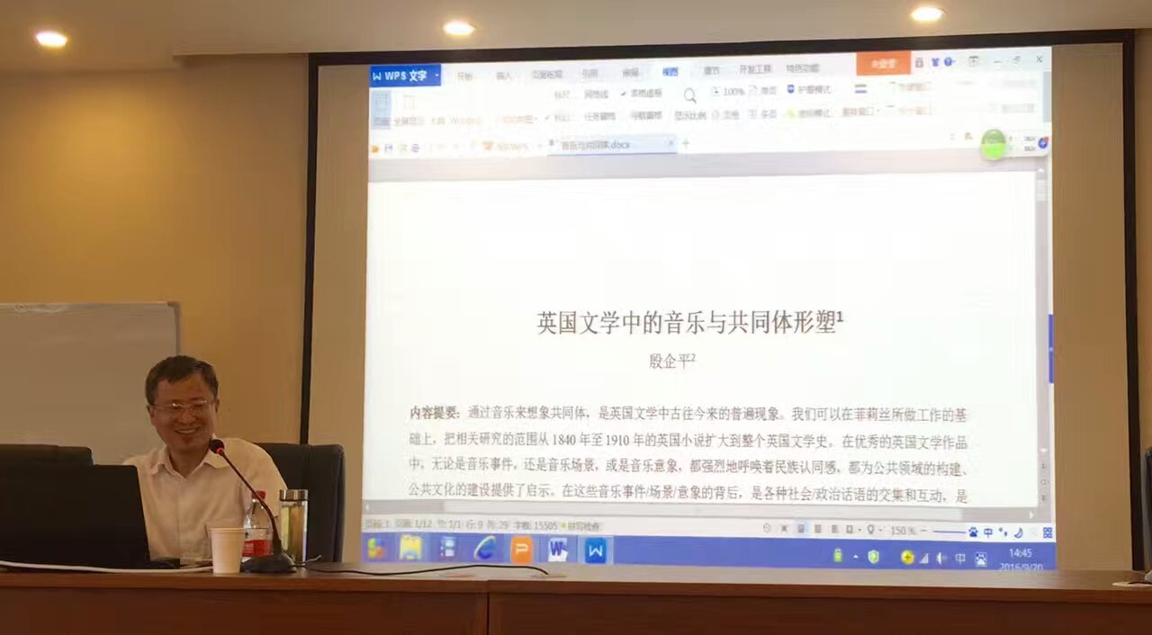 首先,殷教授从学术论文如何选题和论证出发,阐述了选题的学术兴趣及研究意义的重要性;然后,他以自己的论文“英国文学中的音乐与共同体形塑”为例,层层剖析了如何充分论证自己的观点,写好学术论文。最后,殷教授指出,在优秀的英国文学作品中,无论是音乐事件,还是音乐场景,或是音乐意象,都强烈地呼唤着民族认同感,都为公共领域的构建、公共文化的建设提供了启示。在这些音乐事件、场景或意象的背后,是各种社会和政治话语的交集和互动,是重塑共同体的不断努力。