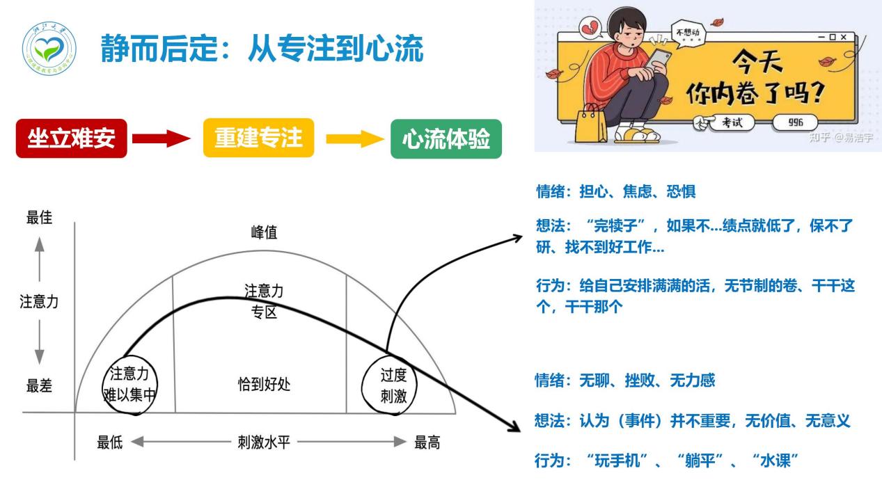 较低的刺激水平会引发无聊挫败的情绪体验,认为所做的事不重要也无意义,于是划水摸鱼,难以集中注意力。而过高的刺激水平会带来强烈的担心、焦虑和恐惧,产生糟糕至极“完蛋了”的想法,常常引发异常紧绷的日程和无节制的卷。只有在外界刺激水平合理时,我们才能进入”注意力专区“达成专注乃至心流体验。