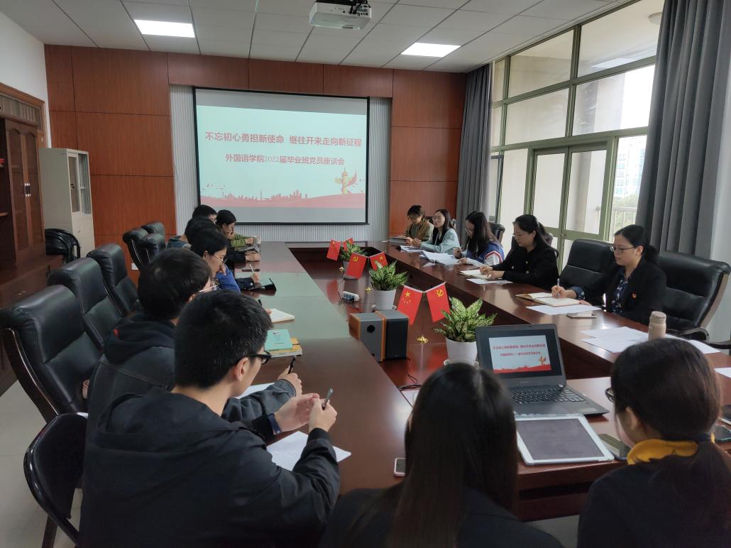 10月28日下午,外国语学院举行“不忘初心勇担新使命,继往开来走向新征程”2022届毕业班党员座谈会。学院党委书记王景、副书记李颂、各学生支部书记、本科生和研究生毕业班党员代表参加活动。座谈会由李颂副书记主持。