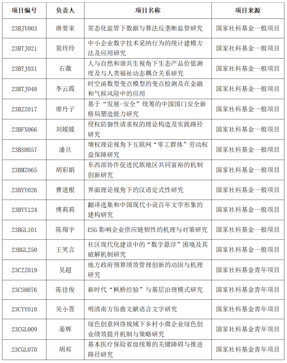 本网讯近日,全国哲学社会科学工作办公室公布了2023年国家社科基金年度项目和青年项目立项课题名单,我校共立项17项。其中一般项目12项,青年项目5项。具体名单如下: