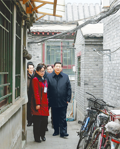 玉河旁的雨儿胡同东起南锣鼓巷,西至东不压桥胡同,是老北京的大杂院区。习近平沿着弯曲狭窄的通道,先后走进29号、30号大杂院,到王云凤、关世岳、吴爱霞、庄宝等4户居民家里察看,嘘寒问暖,关切询问他们工作怎么样、收入有多少、做饭烧什么、取暖怎么办、上厕所远不远?得知他们的居住、生活条件在党和政府关心下有所改善,特别是做饭用上了煤气、取暖用上了电暖气,并且有关部门已经将这片大杂院区纳入了改造规划,习近平很高兴。他表示,这一片胡同我很熟悉,今天来就是想看看老街坊,听听大家对老城区改造的想法。老城区改造要回应不同愿望和要求,工作量很大,有关部门要把工作做深做细,大家要多理解多支持,共同帮助政府把为群众办的实事办好。听说总书记来了,居民们纷纷围上来向总书记问好,习近平走上去同他们热情握手,祝他们生活越来越好。