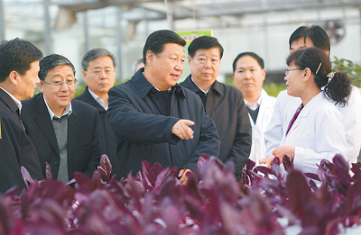 围绕贯彻党的十八届三中全会精神做好“三农”工作,是习近平此次调研的重要内容。27日下午,他来到山东省农科院,视察智能化温室和省农村农业信息化综合服务平台,了解依靠科技创新促进农业发展和农民增收的情况,随后召开座谈会,听取农业科研机构、农业行政部门、基层干部等有关人员对“三农”工作的意见和建议。习近平指出,保障粮食安全是一个永恒的课题,任何时候都不能放松。解决好“三农”问题,根本在于深化改革,走中国特色现代化农业道路。当前,重点要以解决好地怎么种为导向,加快构建新型农业经营体系;以解决好地少水缺的资源环境约束为导向,深入推进农业发展方式转变;以满足吃得好吃得安全为导向,大力发展优质安全农产品。习近平强调,要给农业插上科技的翅膀,按照增产增效并重、良种良法配套、农机农艺结合、生产生态协调的原则,促进农业技术集成化、劳动过程机械化、生产经营信息化、安全环保法治化,加快构建适应高产、优质、高效、生态、安全农业发展要求的技术体系。