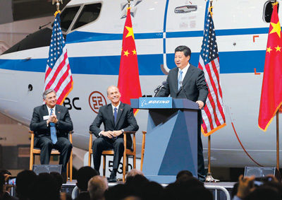 习近平登上一架即将交付中国厦门航空公司的波音—787飞机,同员工们亲切交流。在波音公司举行的欢迎仪式上,习近平在致辞时表示,中国同波音的合作跨越了时代,实现了共赢。中国发展将给美国企业带来更多发展机遇,为双方开展更高水平、更高层次互利合作开辟新空间。