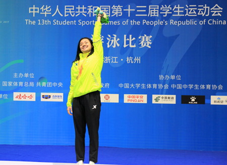 从济南到杭州,徐蔚然开启了她的大学生活。作为我校工商管理学院2016级市场营销专业的学生,学习之余,游泳是她最大的爱好。在刚刚结束的第十三届全国学生运动会游泳比赛中,学校的游泳池给她带来了幸运,她取得了大学女子组甲组200米蛙泳冠军、女子4×100米混合泳接力冠军、大学女子组甲组100米自由泳亚军、400米混合泳亚军两金两银的优异成绩,这里也被称为蔚然的海洋。